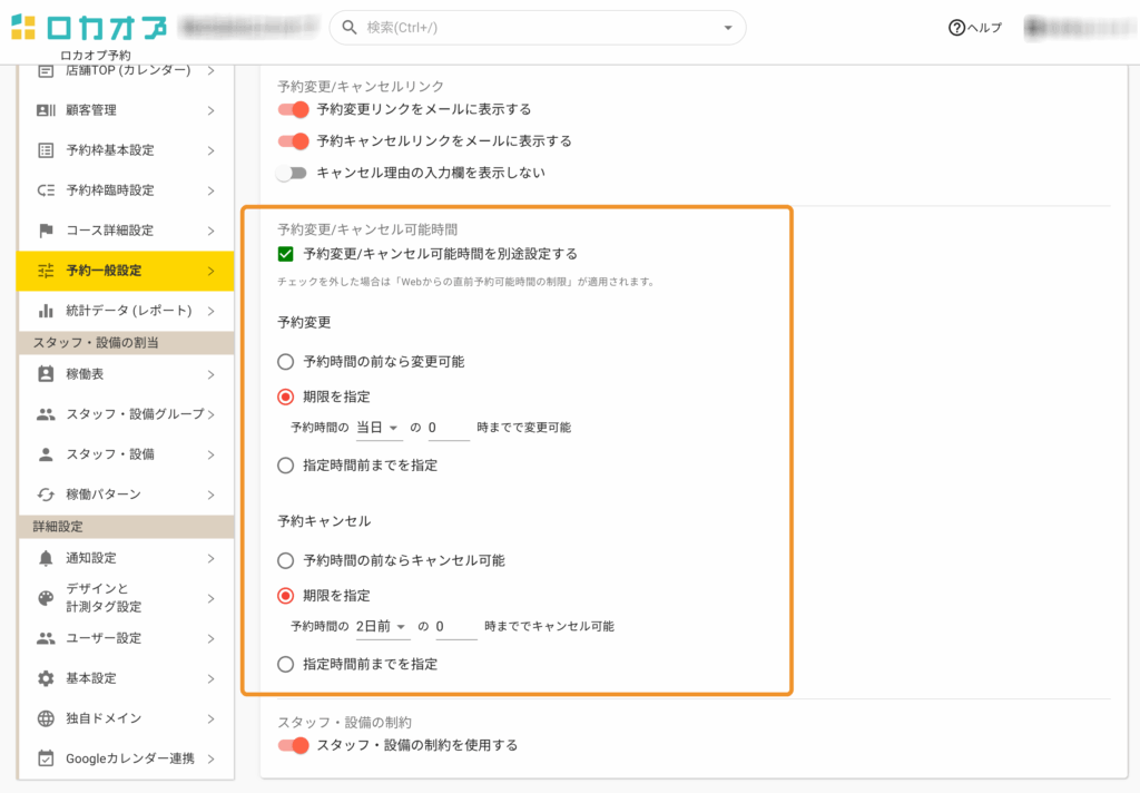 3.「予約変更」欄で「期限を指定」「指定時間前まで」などの形式を選び、日数・時刻を入力します