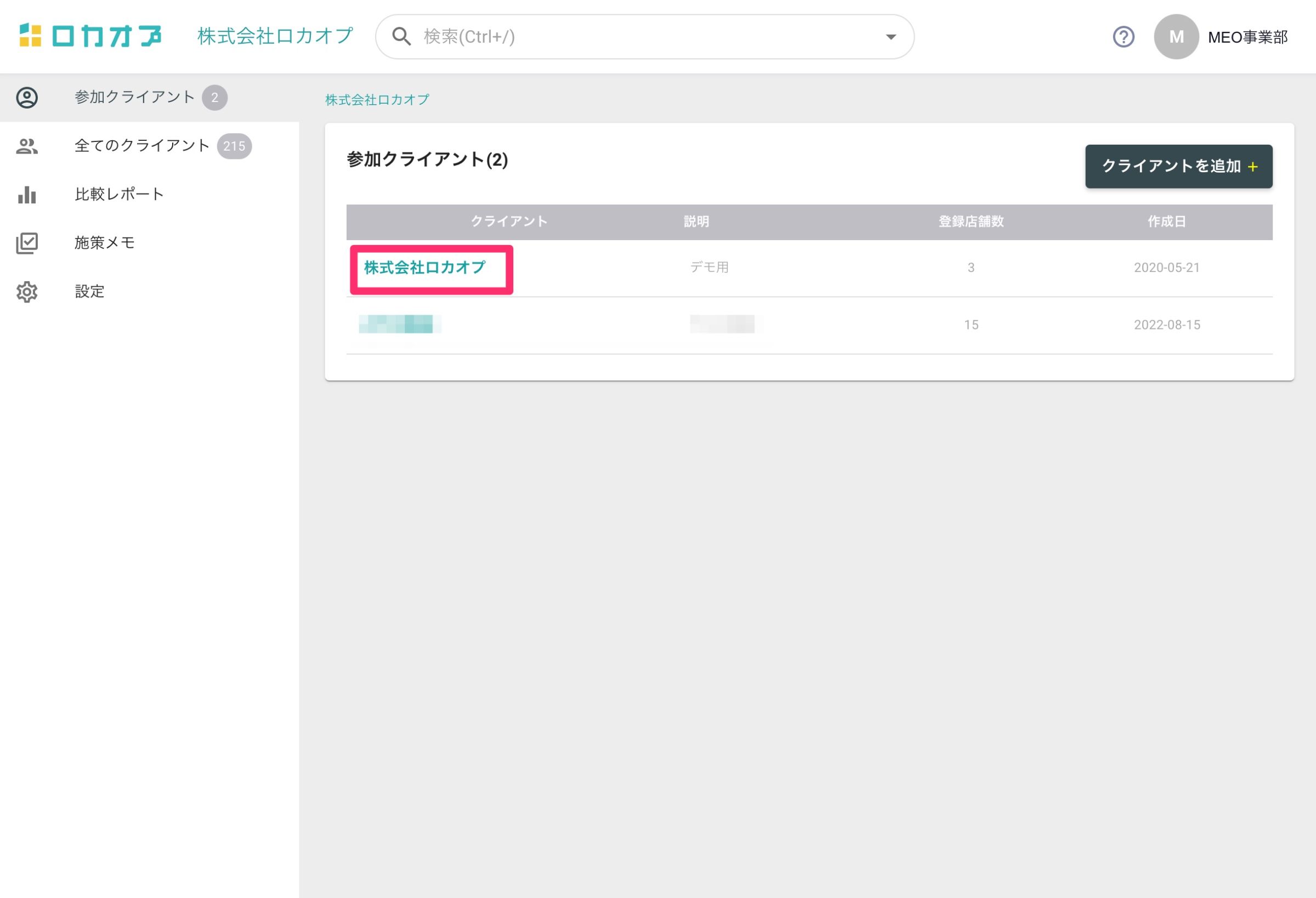 クライアントの店舗一覧を対象に比較レポートは出力されます。適切なクライアントごとに店舗を移動してまとめてからご利用ください。