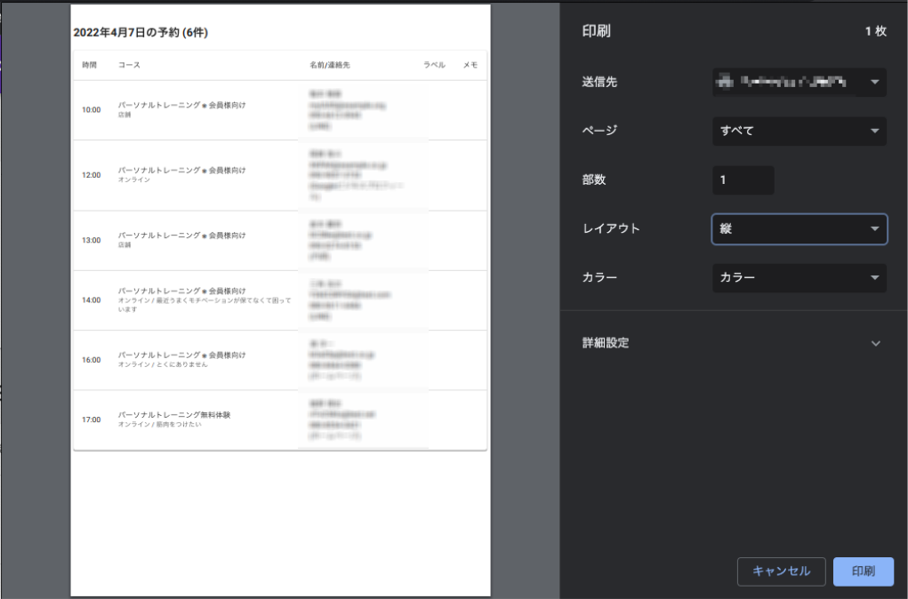 予約者の印刷しておくことで、パソコンやスマホで管理画面を開けないような場面でも、紙で来店者と予約情報を確認することができます。