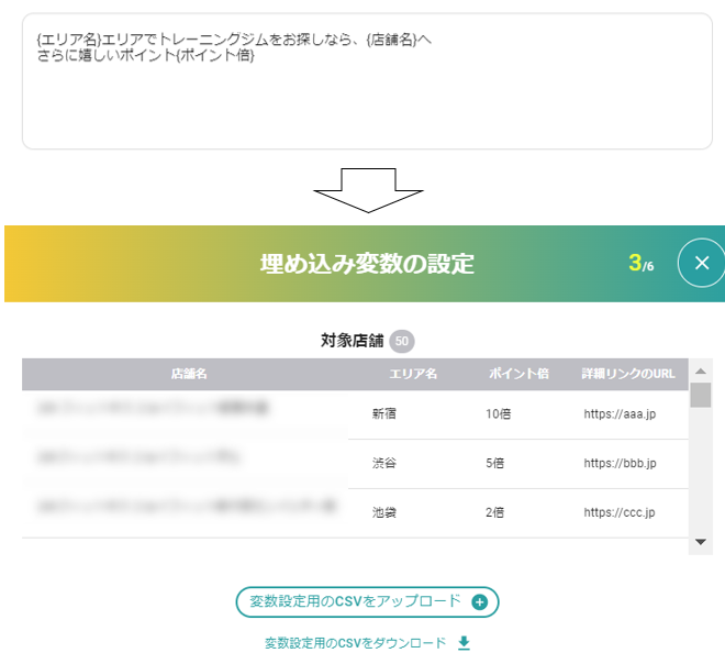 文章内に「変数」を組み込む機能により各店舗ごとに入れ込みたい語句を変更させることができ、例えば店舗ごとに異なる地名を文章内に組み込むといった運用が可能になります。