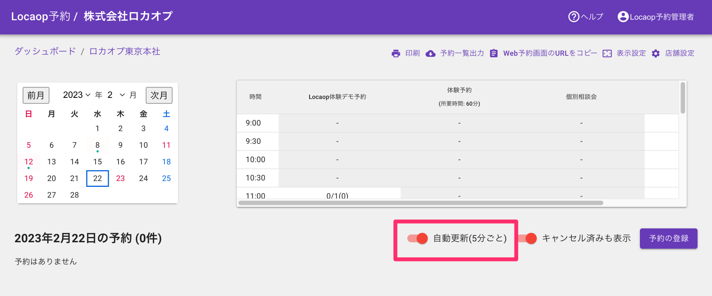 ロカオプ予約の予約一覧画面が自動更新に対応しました。画面上の「自動更新」をオンにすることで、5分おきに予約一覧が更新され最新の情報で表示されます。