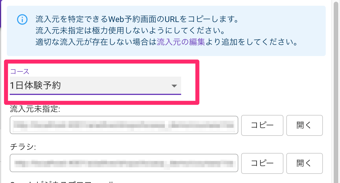 Web予約画面のURLコピー時にコースを指定できるようになりました。これによりコース詳細ページへの直接リンクが簡単に取得できるようになります。