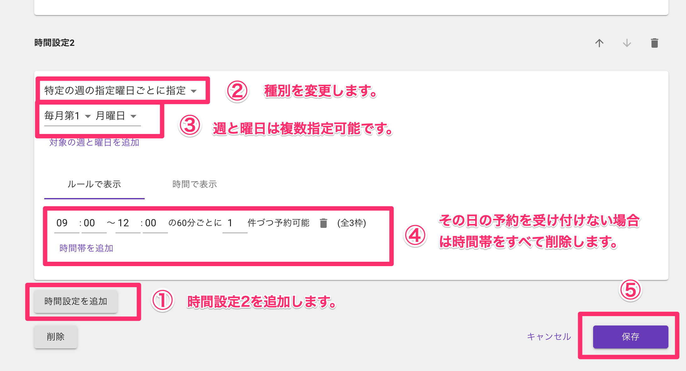 4.種別を「特定の週の曜日ごとに指定」を選択し、「対象の週と曜日」と「時間帯」を設定して保存します。