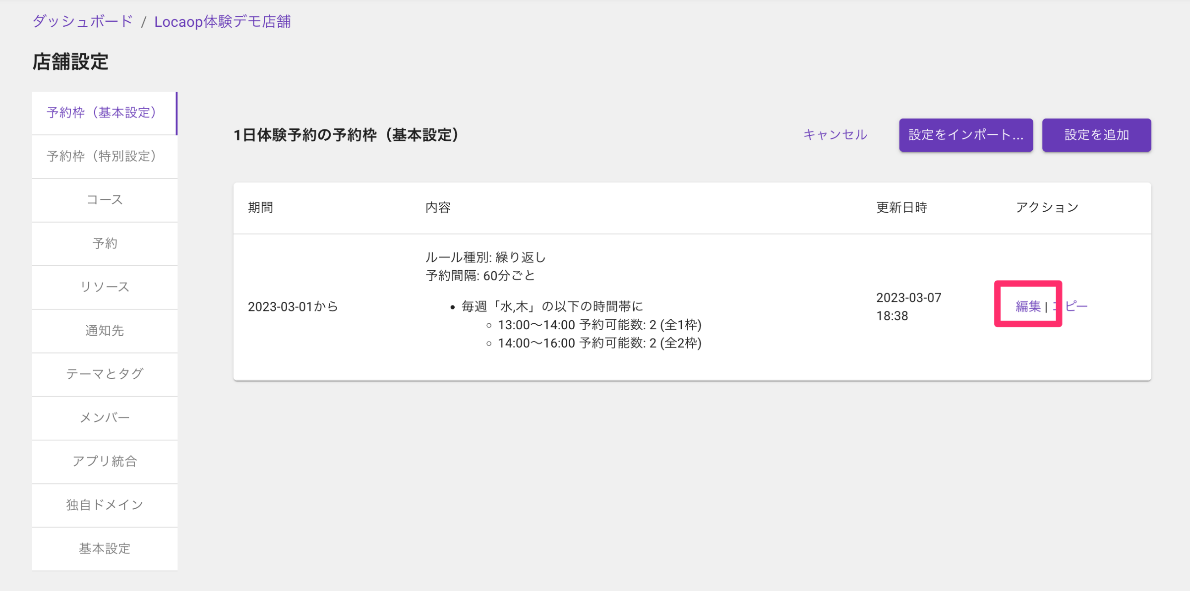 1.店舗の設定から「予約枠(基本設定)」タブを選択し、「予約枠」をクリック
