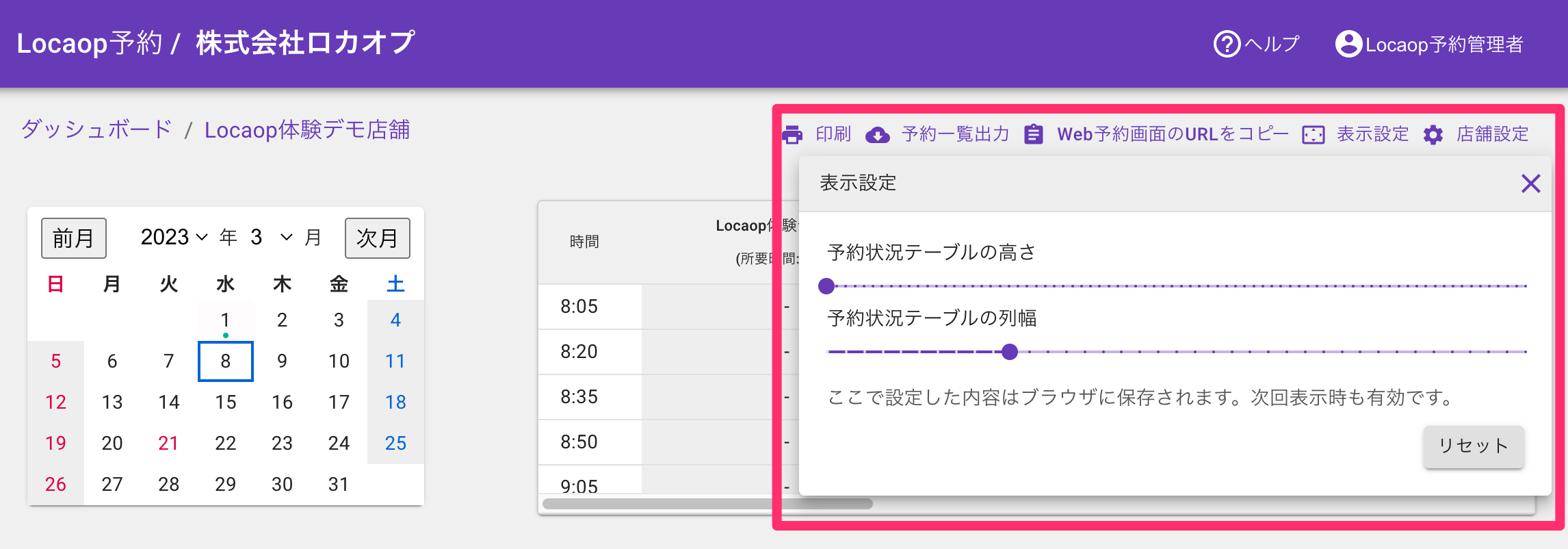 【ロカオプ予約】予約状況テーブルの表示設定が店舗ごとに保存されるようになりました