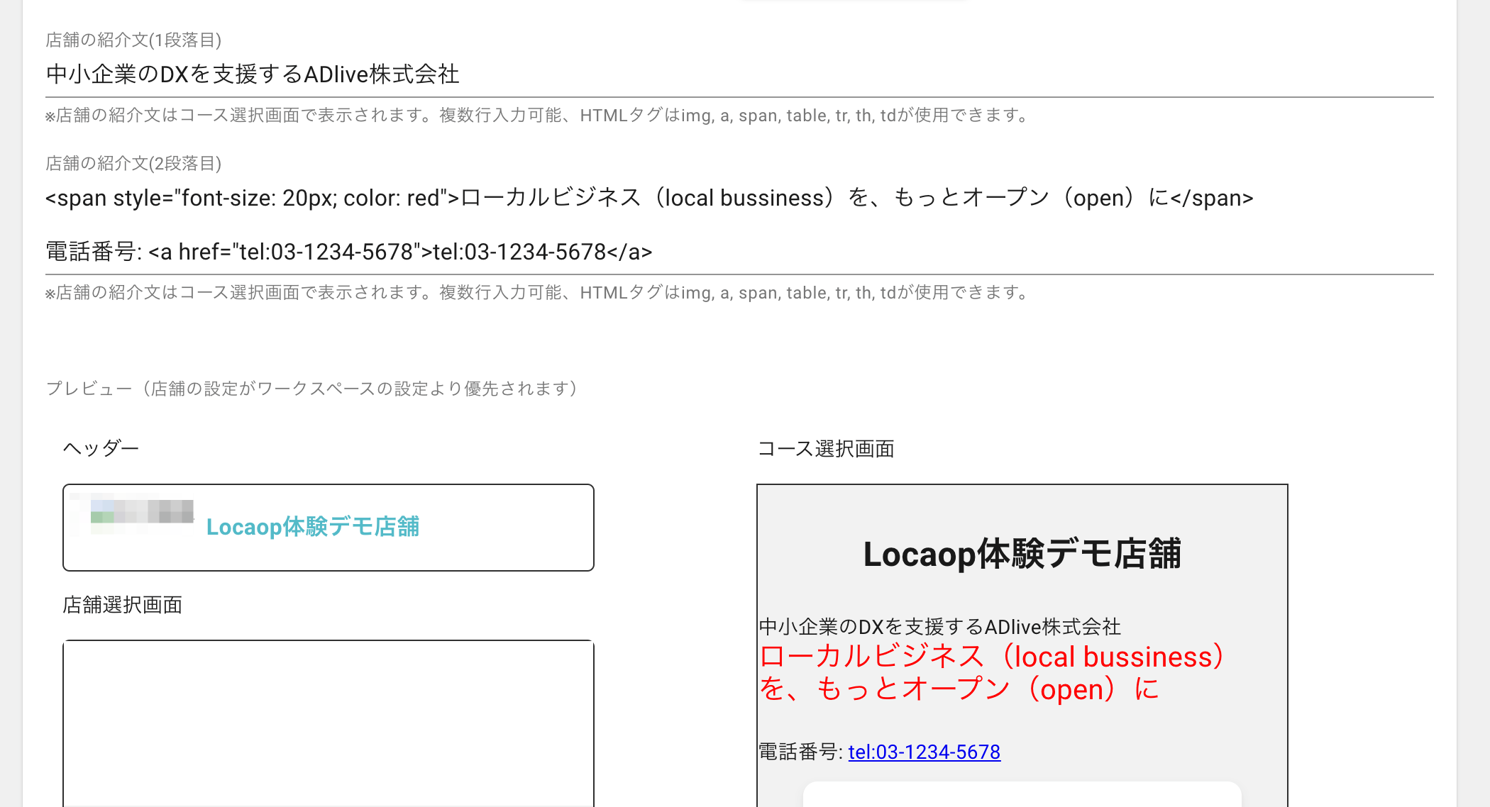 店舗の紹介文をコースの説明と同様に複数行・タグに対応しました。また、今までは中央揃えして説明文が表示されていましたが、左寄せで見やすく表示されるようになりました。