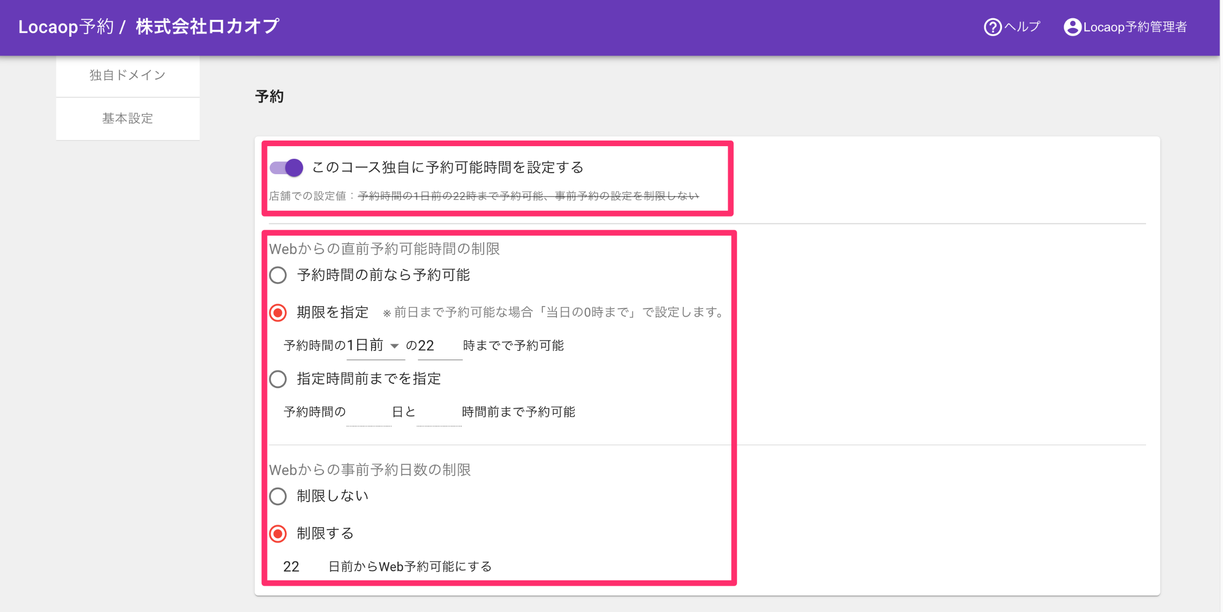 これにより、例えば初回利用者向けのコースは3日前までに予約可能に、会員向けのコースは1日前まで受け付ける、などの柔軟な設定が可能になります。