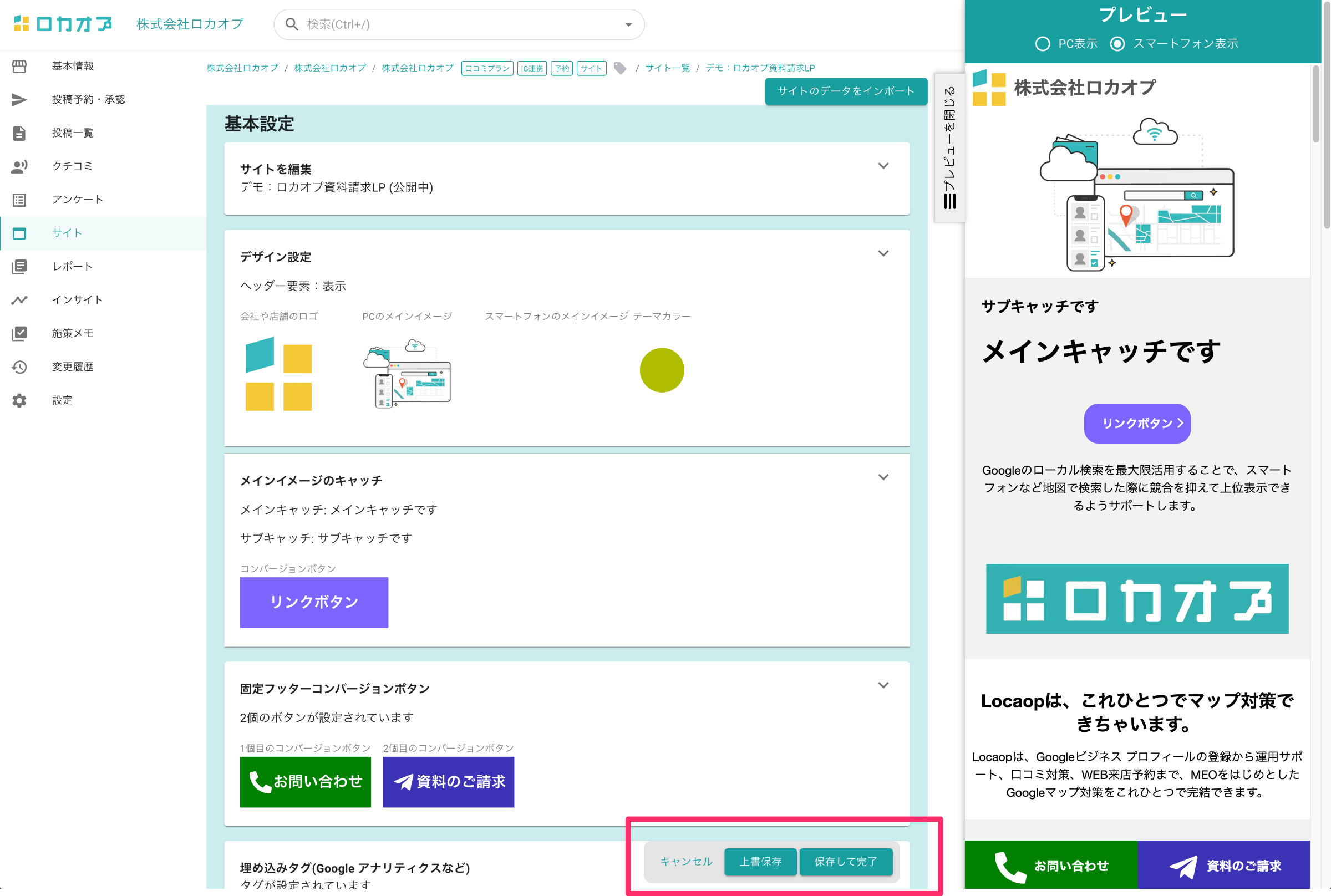 ロカオプサイトの編集画面で編集画面で保存ボタンを常に表示するようにしました。また上書きボタンを追加しました(編集時のみ)。
