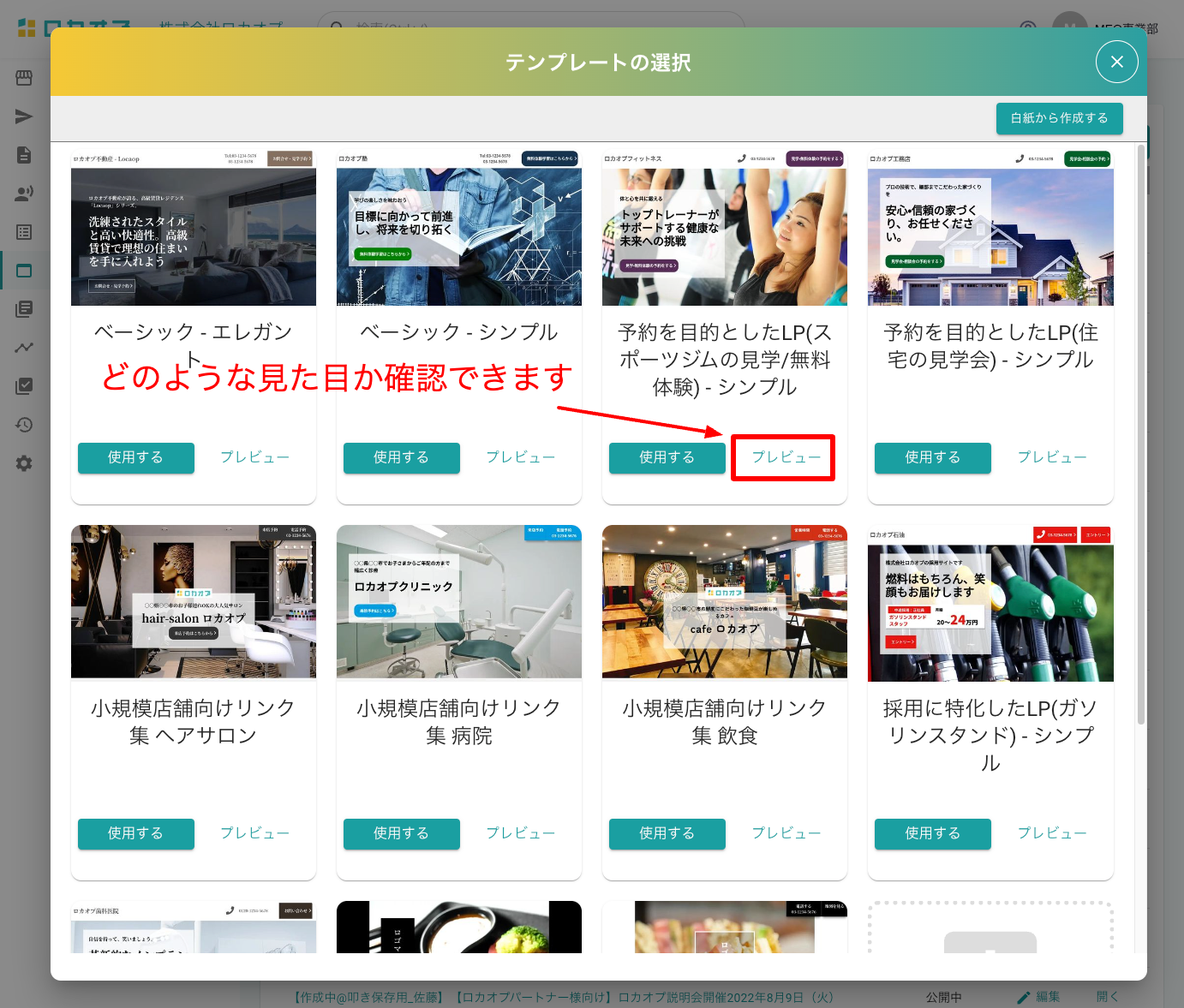 サムネイルだけではわかりにくいのでプレビュー機能をご用意してます、使用する前にどのようなテンプレートが良い確認することができます