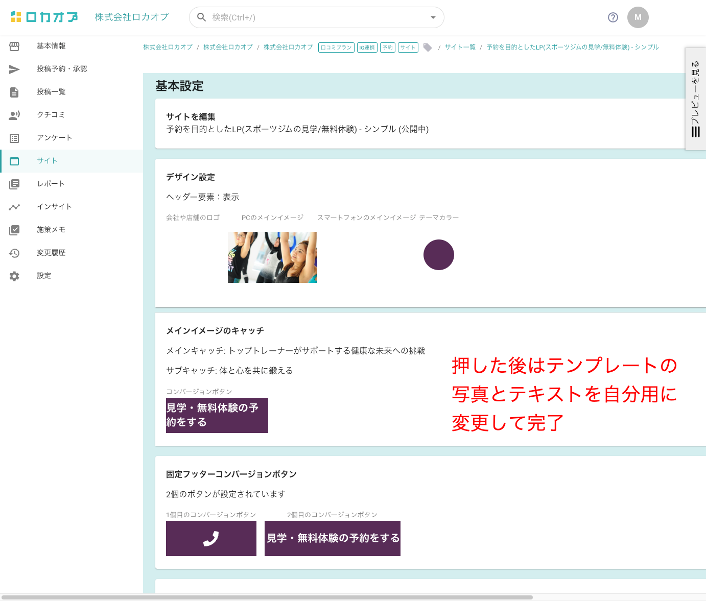 すると全てがプレビューと同じ状態のものロカオプサイトの管理画面になりますのでここで画像とテキストを変更してご自分用に変更されると良いかと思います。