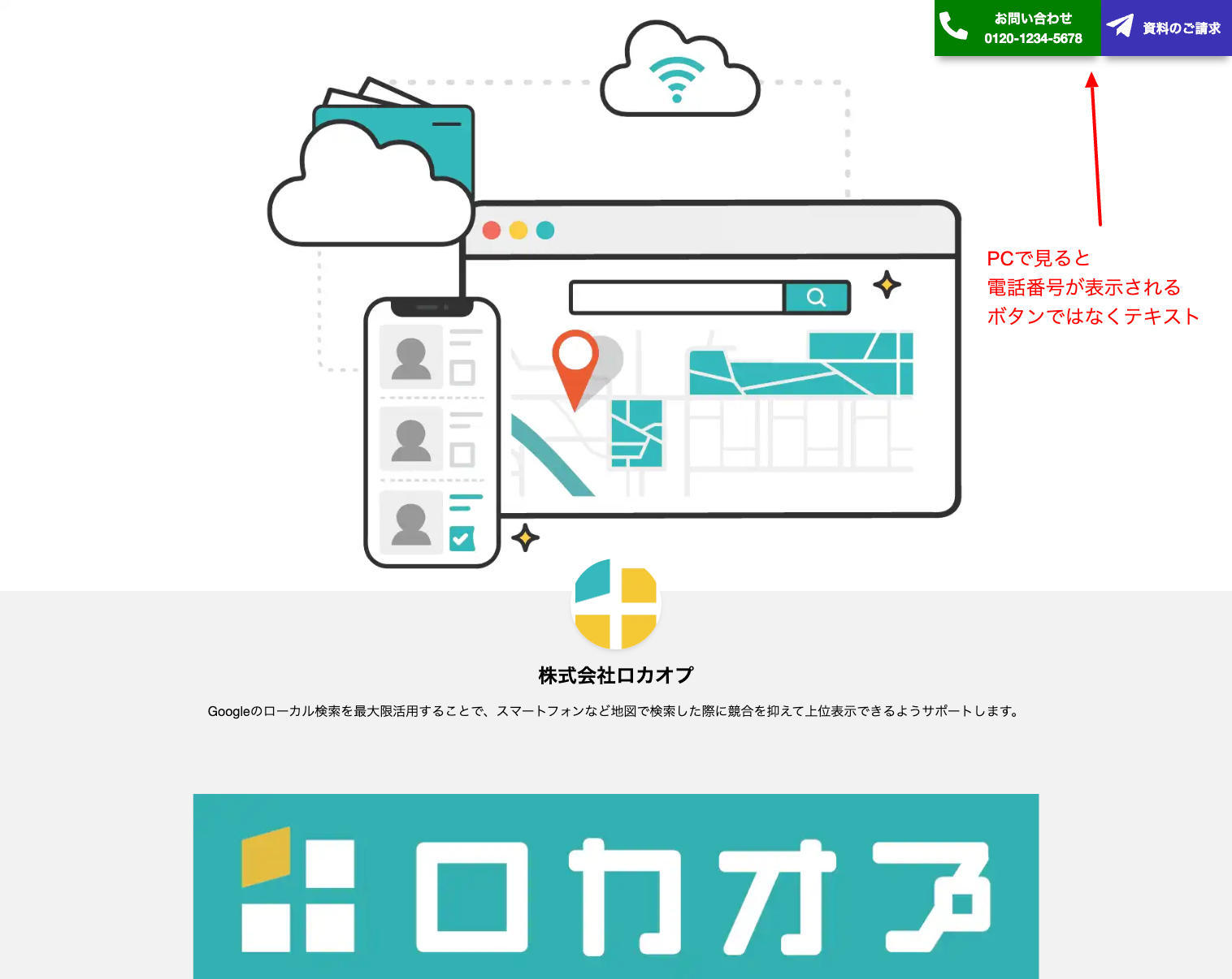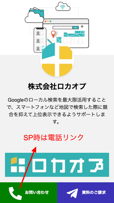 ロカオプサイトの固定フッターコンバージョンボタンはtel:で始まるリンクはスマートフォンで直接電話につながる機能でした、そのためPCで閲覧時は混乱を招くため非表示としておりましたがPCからの電話でのコンバージョンを促進するためボタンではなくテキストで表示されるようにマイナーアップデートを行いました