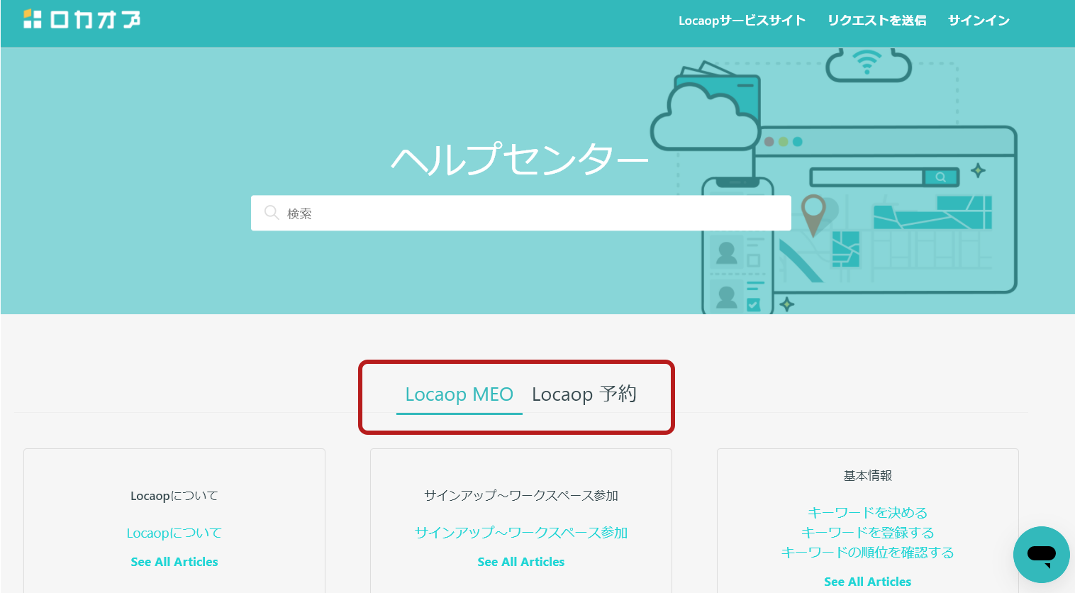 ヘルプセンター、Locaop MEO、Locaop予約の右下にチャットボットが設置されています。調べたい項目を検索すると検索項目に適した記事の一覧が表示され、検索をサポートします。チャットを使用してサポートへ直接問い合わせることも可能です。