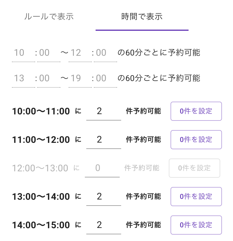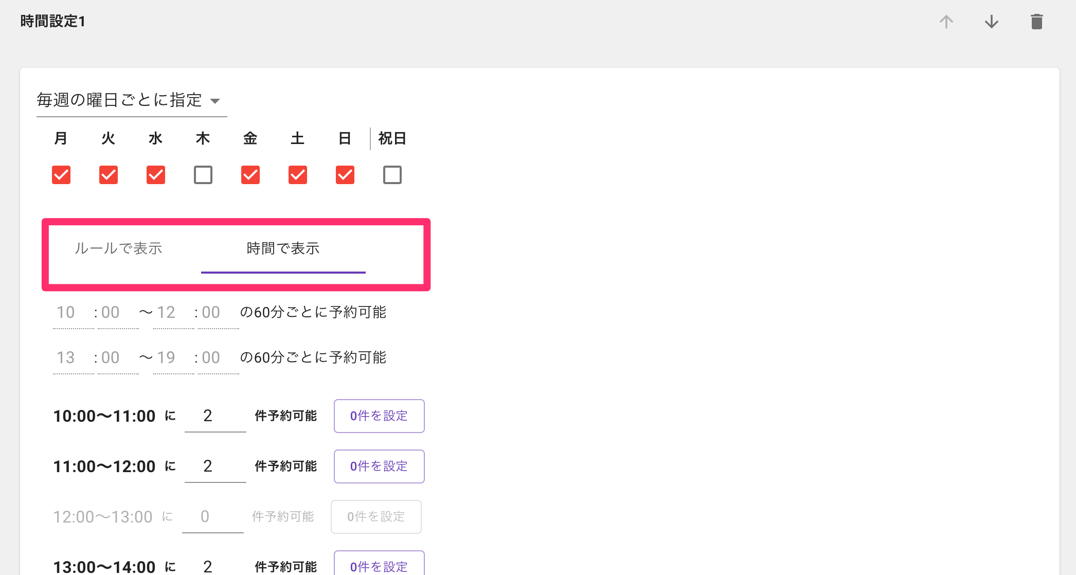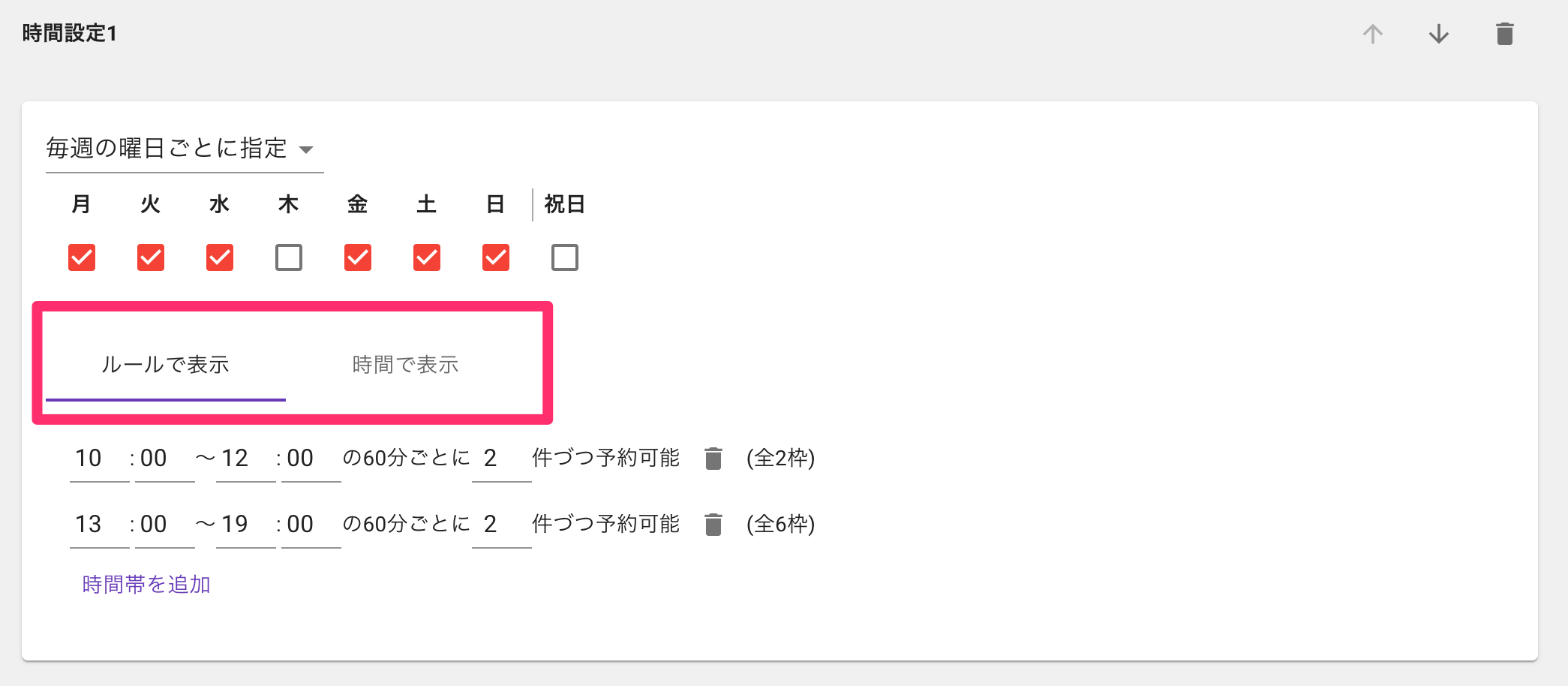 予約枠の編集画面、予約枠の特別設定の時間帯を設定する画面のタブから「ルールで表示」「時間で表示」を切り替えてお使いください。